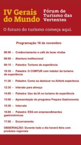 Voltado às tendências e estratégias que impulsionam o turismo regional, o fórum destaca a construção de um turismo sustentável, criativo e transformador, estimulando a troca de experiências e o desenvolvimento coletivo do setor nas Vertentes. A programação inclui conteúdos inspiradores sobre experiências turísticas, conexões autênticas e novas abordagens para fortalecer a identidade da região.